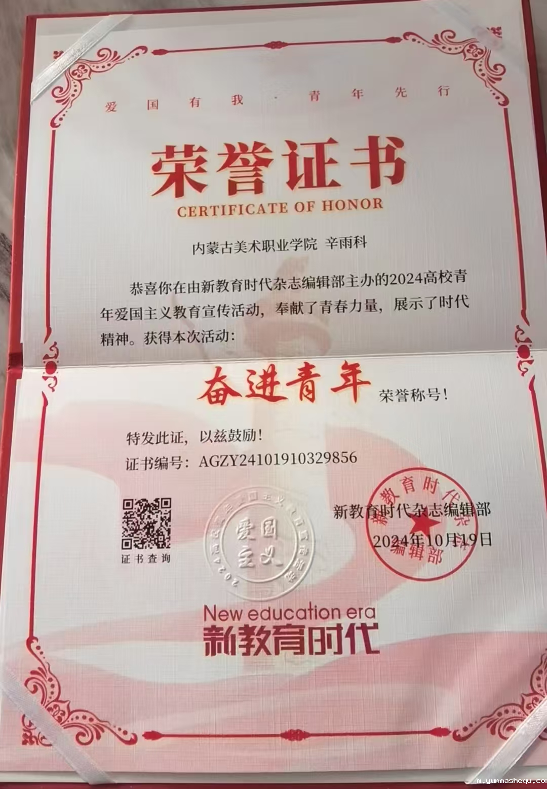 (9)辛雨科同学荣获由新教育时代杂志编辑部主办的高校青年爱国主义教育宣传活动“奋进青年”荣誉称号
