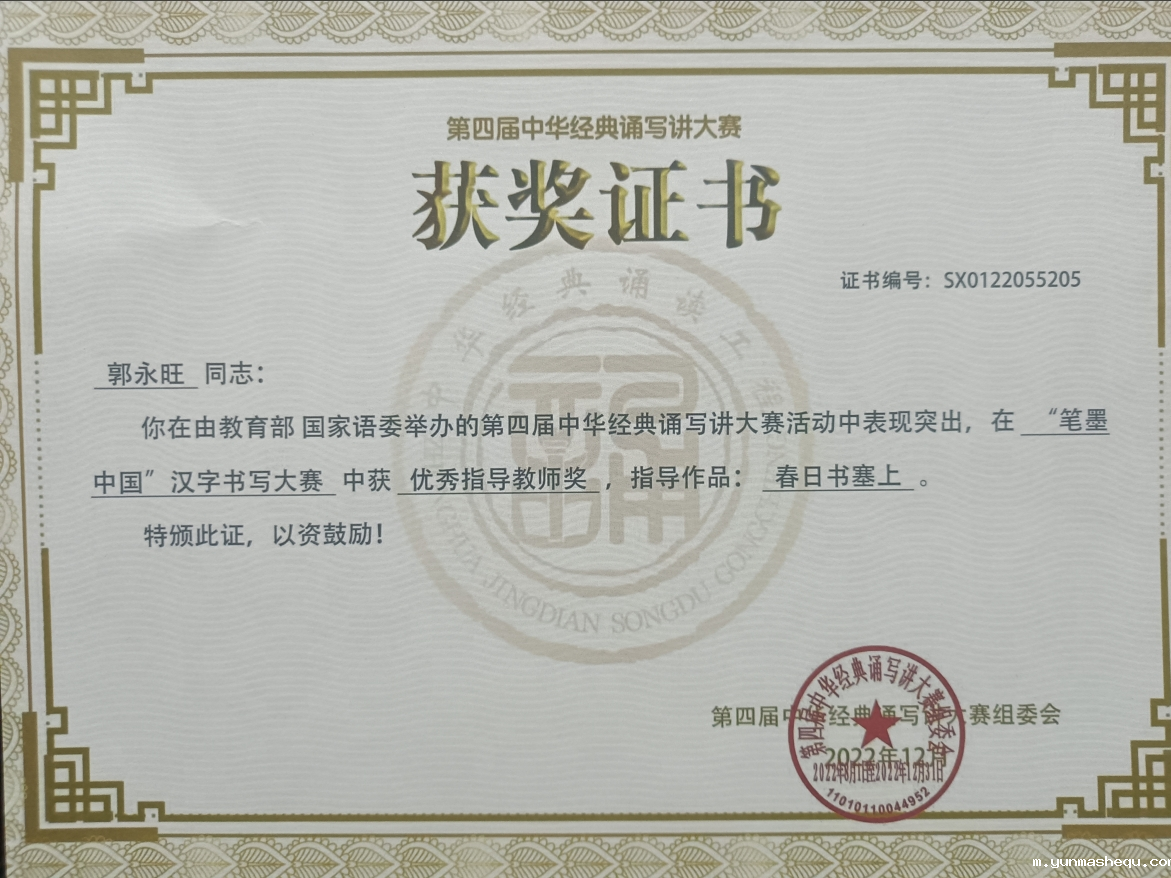(2)院长郭永旺在教育部国家语委举办的“笔墨中国”汉字书写大赛中荣获优秀指导教师奖