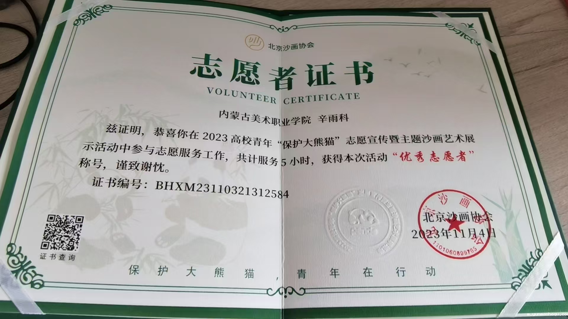 (5)辛雨科同学荣获2023高校青年“保护大熊猫”志愿宣传曁主题沙画艺术展示活动“优秀志愿者”称号
